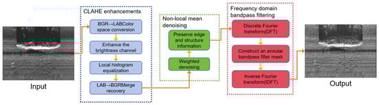 Aiming at the low-contrast, high-frequency noise interference and complex background characteristics of sonar images, this paper proposes a three-stage cascade preprocessing strategy to enhance object detectability through cooperative enhancement and noise suppression. The preprocessing module contains three stages: Adaptive CLAHE enhancement, non-local mean denoising and frequency domain bandpass filtering. The specific realization steps are shown in Figure 3.