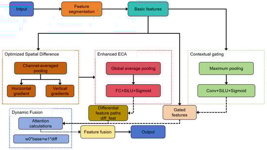 The proposed C2fD architecture addresses essential requirements for contour characteristic capture and underwater object scale adaptation through selective substitution of specific C2f components within the core network architecture. This upgrade enables synergistic feature enhancement and noise suppression while refining the preprocessed high-quality features. The C2fD module incorporates a spatial differential feature extraction component that explicitly computes horizontal and vertical gradients using fixed Sobel operators [43] to amplify edge responses. An Enhanced Efficient Channel Attention (Enhanced ECA) [44] mechanism is introduced, replacing 1D convolution with fully connected layers and optimizing global channel interactions through a reduction ratio of four. This enhancement improves small object detection accuracy and prevents missed detections caused by underwater object size variations. A dynamic fusion [45,46] module is further implemented to adaptively weight and combine base features with differential features, preventing gradient vanishing.