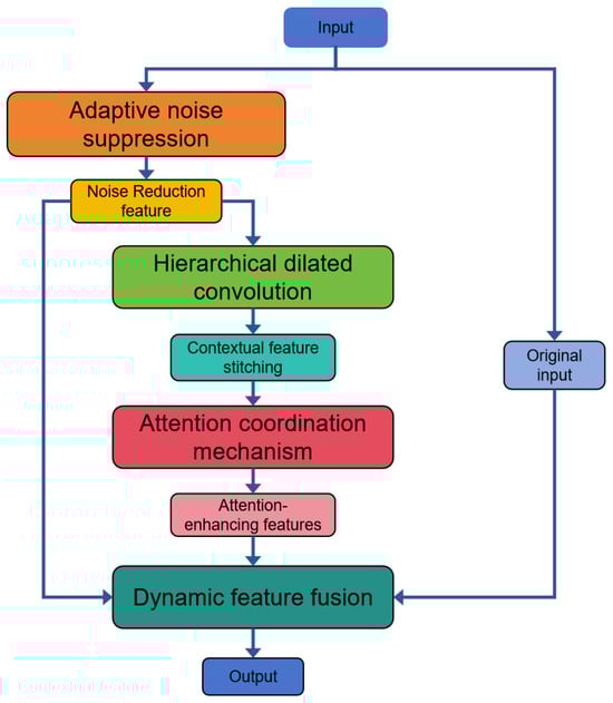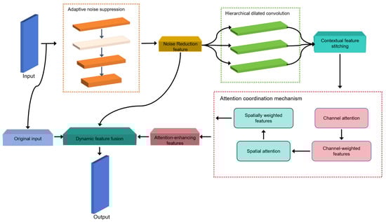 After pre-processing and C2fD module processing, the image may not be able to be completely processed and there may still be a small part of the multi-scale object distribution, residual noise and low signal-to-noise ratio; for this reason, the design of the UnderwaterAttention mechanism is used to ensure that the HAUOD model can completely process all of the image. And the attention mechanism can ensure the coherence of the context to avoid feature loss. The module contains adaptive noise suppression, hierarchical null convolution group, two-dimensional attention synergy and dynamic gated residual fusion, and the overall flow is shown in Figure 7 and Figure 8.