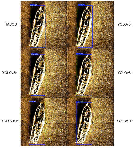 The detection results are obtained according to the models of the comparison test, and the specific results are shown in Figure 9. In summary, the HAUOD model has very obvious advantages over other models in the detection of underwater sonar images.