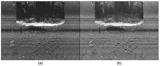In order to verify the rationality and effectiveness of the SonarMosaic module, we can visualize the processing results of this module and compare the visualization results with the initial image, as shown in Figure 10. And in order to more intuitively test the pre-processing results, we adopt the Unified quality Assessment method for Sonar Imaging and Processing (UASIP) [58] to evaluate the performances. With the UASIP method, the initial image’s quality score is , and the pre-processing image’s quality score is , which is higher than the initial image’s. The effectiveness of the preprocessing module is verified through the above test results.