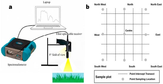In the collection of spectral data for individual dominant plant species, it was essential to minimize or avoid the influence of the soil background. Therefore, small patches of grassland with nearly 100% cover of an individual species were selected. The height of the ground spectrometer probe was adjusted to ensure the field-of-view angle fell entirely within the boundaries of the small patch. To reduce the noise level, each spectrum was based on an average of 10 readings, and a white reference plate was used to obtain the total incident radiant flux for each measurement. The spectral reflectance was calculated as the ratio of the sample spectrum to the white plate spectrum of the reference plate. The spectral data between 1350 and 1400 nm and between 1800 and 2020 nm were discarded due to the low signal-to-noise ratio resulting from severe water absorption outside the atmospheric window. Specific data collection and sampling point distribution are presented in Figure 2.