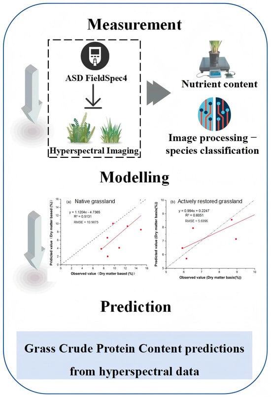 - Qi, H.M.; Chen, A.; Yang, X.C.; Xing, X. Estimation of crude protein content in natural pasture grass using unmanned aerial vehicle hyperspectral data. Comput. Electron. Agric. 2025, 229, 109714. [Google Scholar] [CrossRef]