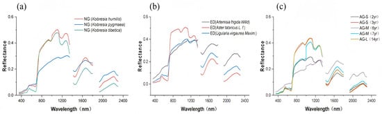 Raw spectral reflectance curves of three typical Kobresia meadows (a), three extremely degraded grasslands (b), and actively restored grasslands of different ages (c).