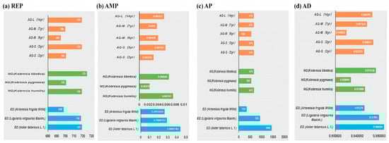 Regarding red-light absorption characteristics, the AP of the extremely degraded grassland did not change but the AD decreased and then increased with an increase in years of restoration (Figure 7c,d). Therefore, we applied the characteristics of AD to identify actively restored meadows at different stages. The red-light absorption of the Kobresia meadows decreased and then increased, with K. pygmaea meadows having the smallest AD and AP (550 nm and 0.9280, respectively). In comparing the size of the red-edge position in the extremely degraded meadows, L. virgaurea > A. tataricus > A. frigida, clearly moving towards the short-wave band, and the variation in AP spans the range of 353 nm–1444 nm (Figure 7c,d).