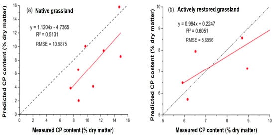 Correlation between optimal predictive model and measured value of crude protein content in grassland vegetation: (a) estimation effect of native grassland; (b) estimation effect of actively restored grassland.