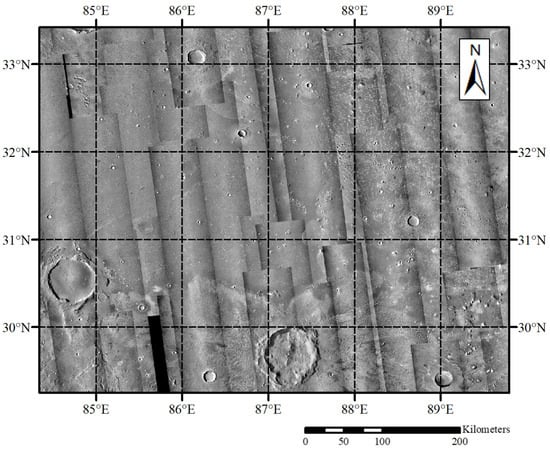 - Edwards, C.S.; Nowicki, K.J.; Christensen, P.R.; Hill, J.; Gorelick, N.; Murray, K. Mosaicking of Global Planetary Image Datasets: 1. Techniques and Data Processing for Thermal Emission Imaging System (THEMIS) Multi-Spectral Data. J. Geophys. Res. 2011, 116, 3755–3772. [Google Scholar] [CrossRef]