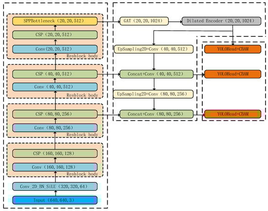 Compared with the structure in Figure 1, we added the GAT module and the Dilated Encoder module to enhance the feature expression ability; the upsampling operation in FPN has been canceled, and only the downsampling is required to fuse with the features of the previous layer. The CSP module has also been canceled, which can reduce the number of parameters to a certain extent, depending on the benefits brought by the GAT module and the Dilated Encoder module. Finally, CBAM was added to the YOLOHead module.