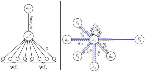 where represents the attention coefficient of node to node , and is the attention mechanism function. In Formula (2), each node can focus on all other nodes, ignoring the intrinsic topology information between nodes. In order to consider the topology of the graph, when a GAL calculates the attention coefficient, only the attention coefficient of node is calculated, and represents the set of first-order adjacent nodes of node . In order to facilitate comparison of attention coefficients of different nodes, the attention coefficients of all nodes are normalized, and the processing process is structured as follows: