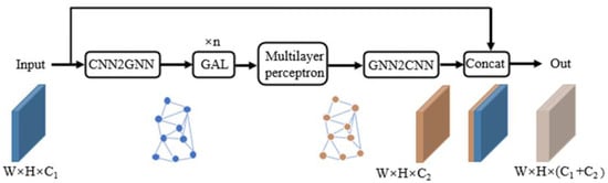 The GAT module is shown in Figure 4: First, the feature map is transformed into a graph data structure through feature mapping (pixels in the feature graph are regarded as graph nodes, and the relationships between pixels are regarded as edges), and represents the input feature graph. Then there are nodes in the converted graph data, and the feature vector dimension of each node is . The adjacency matrix size is . Then, the graph data is input into the graph attention network built by multiple GAL to extract topological features, multi-layer perceptron is used to transform the features extracted from the graph attention network. In this case, the dimension of the feature vector of the node matrix is , which is transformed into the feature graph of after the feature mapping. Finally, and are spliced into a new feature graph. The final output is obtained.
