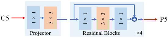 This study employs the Dilated Encoder network as the architectural foundation for space object detection, building upon YOLOF’s seminal contribution that redefined feature pyramid optimization through single-scale feature utilization. The architecture demonstrates a comparable detection accuracy to traditional FPN-based systems while achieving an enhanced computational efficiency. The Dilated Encoder network architecture (Figure 5) implements a feature enhancement strategy through two principal components: Initial Convolutional Module and dilated residual blocks.