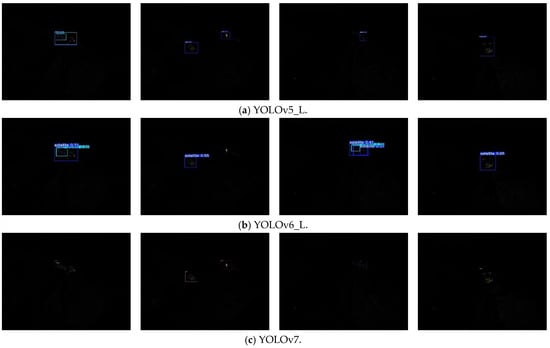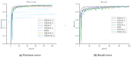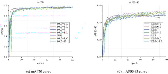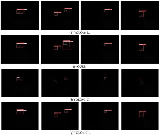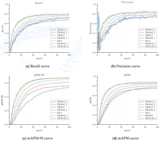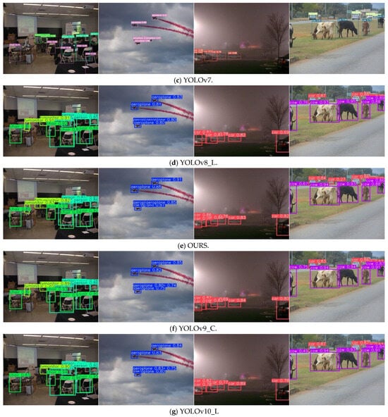 We used the space object dataset to verify the universality of the algorithm proposed in this paper and conduct a comparative analysis with the excellent algorithms produced in recent years. These include YOLOv5_L [], YOLOv6_L [], YOLOv7 [], YOLOv8_L [], YOLOv9_C [] and YOLOv10_L []. The contrastive experimental results on the VOC2007 + 2012 dataset are shown in Table 1 and Figure 8 and Figure 9.