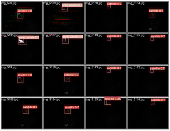 Because the current space object datasets do not take into account the problem of object detection in complex environments, such as light interference and dark–light environments, in this paper, we re-establish a space object dataset, and enhance and annotate the data, including 8000 images of satellites and solar panels. Finally, we verify the advanced nature of the improved algorithm with dataset. Some pictures of the dataset are shown in Figure 7.