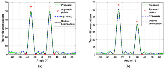 Figure 1. Transmit beampattern performance comparison. (a) β 1 = β 2 = 0.5 . (b) β 1 = 0.6 , β 2 = 0.4 .