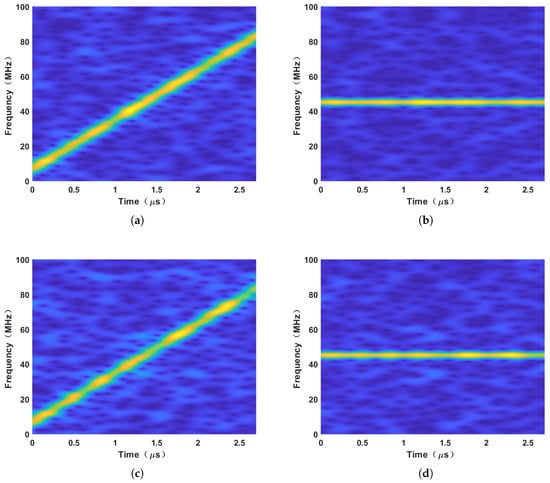 Figure 11. The ISRJ suppression results. (a) The reference LFM signal. (b) The AW at 30 ° of the proposed waveform. (c) The AW at 20° of the proposed waveform. (d) The AW at 30 ° of the CZT-WWD waveform.