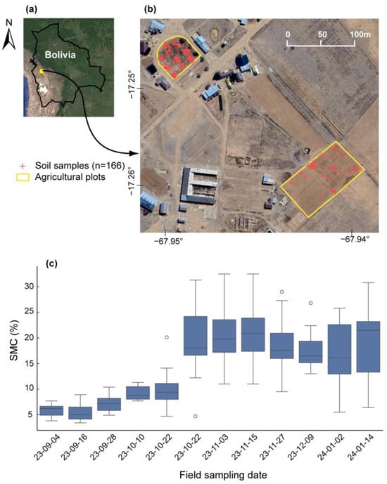 The study area in Bolivia (a), along with the location of 166 soil sample sites within agricultural plots (b) and Boxplot of the volumetric soil moisture measurements obtained during the study period (c). White circle represent the outlier SMC measurements.