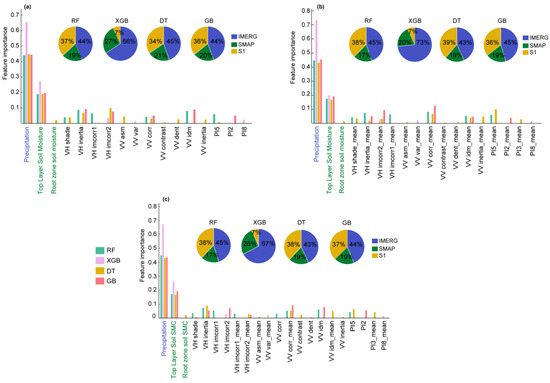 Feature importance values for selected independent features and scenario-2, -3, and -4 (a,b,c, respectively), along with cumulative feature importance for IMERG, SMAP, and S1 independent features. Note that S1 features are computed with the composite images ending with “_mean”.
