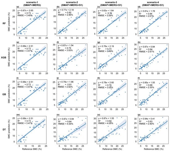 Scatter plot comparing reference and prediction SMCs obtained with scenario-1, -2, -3, and -4 for the validation step with (a–d) RF, (e–h) XGB, (i–l) GB, and (m–p) DT.