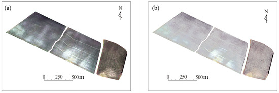 The UAV multispectral data were processed using Environment for Visualizing Images software (ENVI 5.3) to ensure data quality and reliability. The processing workflow involved band fusion, radiometric calibration, and atmospheric correction. These steps were essential for minimizing sensor and atmospheric interference, thereby enhancing the accuracy of the reflectance data. The UAV data featured an ultra-high spatial resolution of 0.07 m, providing detailed surface information critical for soil moisture analysis.