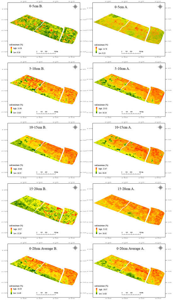 This study systematically investigated the effects of vegetation suppression technology on soil moisture retrieval accuracy across different soil depth layers (0–5 cm, 5–10 cm, 10–15 cm, and 15–20 cm) by integrating UAV multispectral data and Sentinel-1 radar data with a random forest algorithm. Statistical metrics, including R2 and MAE, were employed to evaluate the stratified impacts of vegetation suppression on remote sensing-based soil moisture inversion (Table 2), and the spatial distribution of soil moisture at different soil layers before and after vegetation suppression was achieved, as shown in Figure 5.