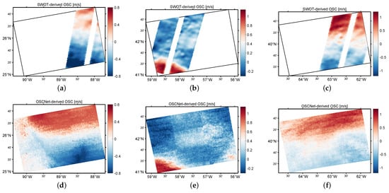 In this study, we utilized S1 and SWOT data from July 2023 to September 2024, yielding approximately 100,819 matchups for the training, validation, and testing of the OSCNet model. The proposed model was evaluated using the metrics outlined in Section 3, where the , MAE, and RMSE reached 0.81, 0.15 m/s, and 0.19 m/s, respectively (see Table 2). To visualize the results, three examples were randomly selected, as shown in Figure 4. Figure 4a,d,g show the radial velocity of the OSC retrieved by the proposed model OSCNet, and Figure 4b,e,h display the OSC derived from SWOT data projected onto the S1 SAR radial direction. Figure 4c,f,i present a comparison between the OSCNet-derived OSC and the SWOT-derived OSC. It can be observed that the OSCNet-derived OSCs are highly consistent with the SWOT-derived OSCs, with the optimal RMSE being 0.14 m/s.