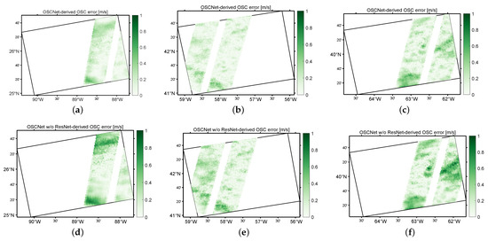 We evaluated the impact of ResNet architecture on model performance while maintaining the model’s input parameters at their optimal configuration. As shown in Figure 5d–i, the OSC retrieval results of the OSCNet model with the ResNet structure closely align with the ground truth, whereas the OSCNet model without the ResNet structure exhibits larger deviations. These discrepancies become more pronounced in regions with higher OSC velocities (see Figure 6a–f). The model’s performance across the entire test dataset is presented in Table 2. As can be seen, the exclusion of the ResNet structure from OSCNet (see “OSCNet w/o ResNet” in Table 2) results in a decrease in , along with an increase in MAE and RMSE, compared to the OSCNet model incorporating ResNet. These results indicate the positive influence of incorporating ResNet architecture in enhancing the performance of the OSCNet model in OSC retrieval.