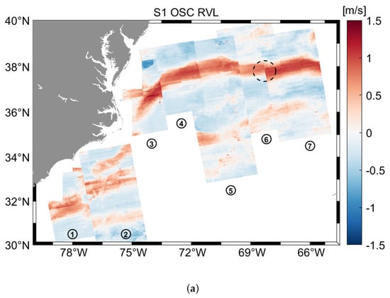 Figure 7 presents the large-scale OSC retrieval results of the Gulf Stream using the proposed OSCNet model. Figure 7a displays the radial velocity components of OSC derived using OSCNet from seven S1 SAR scenes (numbered 1 to 7) acquired on 12, 19, 26, 9, 16, 11, and 18 August 2023, respectively. Figure 7b shows the Hybrid Coordinate Ocean Model (HYCOM)-simulated OSCs, averaged over the same times as the seven-track SAR data acquisition times. The OSCNet-derived OSC RVL and the HYCOM-simulated OSC exhibit a high degree of consistency in terms of OSC direction, particularly where the Gulf Stream’s primary flow aligns with the S1 SAR radial direction. Although the Gulf Stream deviates from the SAR radial direction in Track 3, the current’s intensity remains sufficiently strong to produce detectable radial velocity components, enabling effective OSC characterization. It is worth noting that a discontinuity in the OSC is observed at the boundary between tracks 6 and 7 (indicated by the black dashed circle in Figure 7a). This discontinuity is mainly caused by two factors: First, the OSC between adjacent SAR scenes is not temporally correlated due to the 7-day time interval; second, the local change in the direction of the Gulf Stream (shown by the red dashed circle in Figure 7b) further exacerbates the OSC RVL misalignment. To mitigate the impact of temporal mismatches, several strategies can be employed. One approach involves the assimilation of complementary data sources, including numerical ocean model outputs, HF radar observations, and satellite altimetry measurements, to provide continuous temporal coverage between SAR acquisitions. An alternative strategy is the use of time-series models, such as recurrent neural networks (RNNs) or long short-term memory (LSTM) networks, which are capable of capturing the temporal dynamics of ocean currents and accounting for their evolution over time.