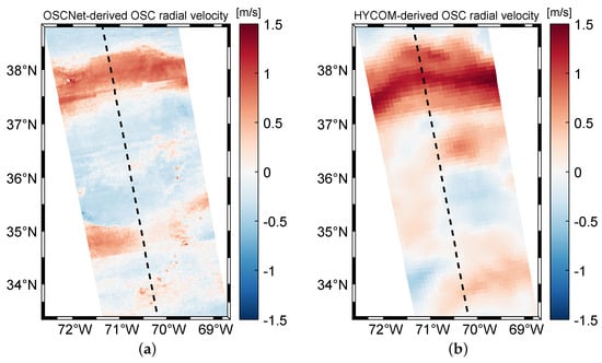 The retrieval results of the Gulf Stream. (a) OSC RVL derived from S1 SAR time-series Doppler observations using the proposed OSCNet. (b) HYCOM-simulated OSCs temporally averaged over the S1 SAR time-series data acquisition period.