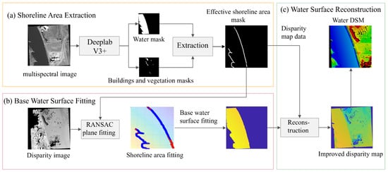 Overall framework of our algorithm: (a) Effective shoreline area extraction: The multispectral image includes the R, G, and B bands, which are useful to semantic segmentation. Multiple strategies are employed to derive an effective shoreline ground mask. (b) Base water surface fitting: On the basis of the effective shoreline data, a RANSAC plane fitting strategy with slope and inclination constraints is applied to assign values to the water surface region according to the fitted plane parameters, resulting in a base water surface. “Disparity image” is generated by SGM [22] (c) Seamless water surface reconstruction: A high-precision water surface DSM is generated on the basis of the optimized disparity map.