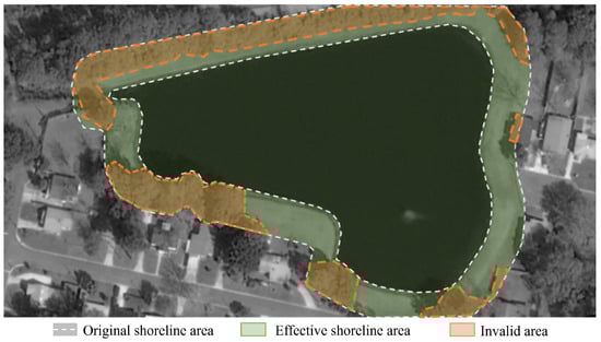 Effective shoreline area extraction under ideal conditions. The white dashed line represents the extracted preliminary shoreline area, the orange region indicates the excluded invalid areas, and the green region denotes the retained effective shoreline area.