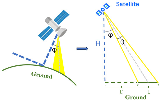 Angle threshold deduction process. The left side represents a schematic diagram of the satellite’s flight process, whereas the right side shows a planar diagram for easier calculation. H denotes the satellite’s orbital altitude, D represents the horizontal distance, and L refers to a line segment within the ground imaging plane. For simplicity in the calculations, the maximum value of L is used, corresponding to the ground length of the image diagonal. is the off-nadir angle or backward angle, and is the angle formed by the light entering the satellite camera during the imaging process.