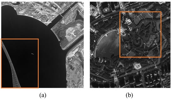 We use WV-3 panchromatic images from a river and sea in Jacksonville, FL, USA. The pixel sizes of the two types of images are 2993 × 3070 and 3013 × 3072. The satellite’s off-nadir angle and orbital altitude are 70° and 617 km [42].
