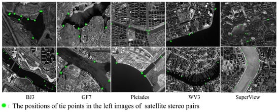 For each high-resolution satellite stereo pair, the left-view image is presented. Tie points are selected from effective shoreline area near each connected water body region, and the distribution of tie points is marked with green circles. The extraction of tie points is influenced by key imaging parameters, including resolution, viewing geometry, scene extent, and noise characteristics, which collectively determine both the quantity and matching reliability.