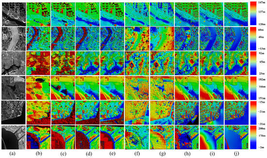 DSMs generated by different algorithms. (a) Image. The first row and the fourth row are Beijing-3 images, the second row is Superview image, the third row is a GF-7 image, the fifth row is a WV-3 image, and the third row is a Pleiades image. (b) ACVNet [14]. (c) GwcNet [43]. (d) HFF [44]. (e) PSMNet [45]. (f) ASF [46]. (g) IGEV++ [13]. (h) SGM [22]. (i) Reconstruction Master version 6.0 [34]. (j) Ours. Our proposed BPC-SWSR has superior performance in water surface optimization.