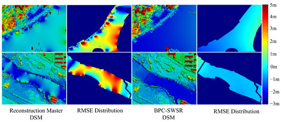 DSM results and RMSE distribution maps generated by the Reconstruction Master version 6.0 [34] and the proposed BPC-SWSR. The second column is generated by Reconstruction Master version 6.0 [34] and the fourth column is generated by ours. The first row shows the reconstruction results from the GF-7 images. The second row shows the reconstruction results from the Beijing-3 images. Reconstruction Master version 6.0 [34] makes trees or buildings and the water surface abnormally connected in the shore area, resulting in abnormal water surface undulations.