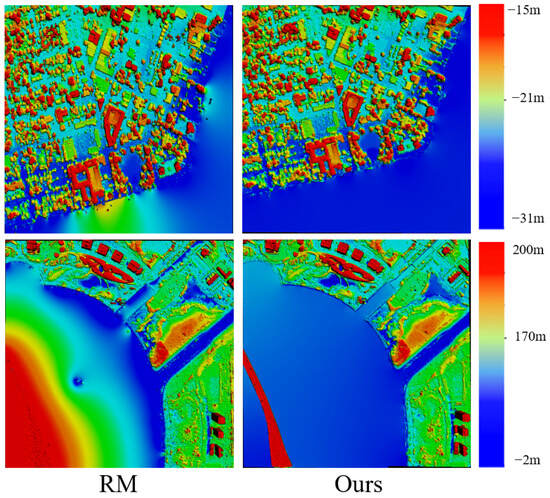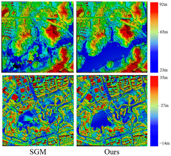 The data in Figure 8 show that the DSM results generated by SGM [22] contain many anomalous undulations in the lakes surrounded by vegetation and buildings. Moreover, selecting effective shoreline areas for these lakes is challenging. Our proposed “global plane fitting” strategy ensures that the reconstruction results are not affected by vegetation and buildings, preventing anomalous undulations.