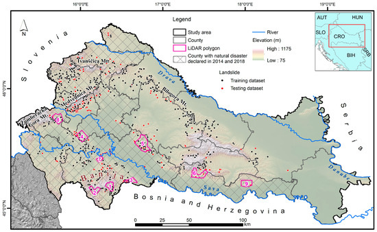 The study area covers the entire northern and eastern continental part of Croatia, spanning 29,785 km2, or approximately 50% of Croatian territory (Figure 1). This region forms part of the southwestern Pannonian Basin System [17], where geological settings greatly contribute to landslide susceptibility, particularly in areas with unfavorable geomorphological characteristics. Given that slides and flows occurring in soils are the predominant types of landslides in this region, the term “landslide” in this study refers exclusively to these types. The area is predominantly composed of plains, shaped mainly by the river systems of the Sava, Drava, and Danube. Roughly 78% of this region lies below 200 m in elevation. The landscape alternates between lowland plains and hilly or low mountainous terrain. Among these, Bilogora Mt. is the lowest, reaching an altitude of 309 m, while the highest peaks are on Medvednica, Ivanščica, and Žumberačka Gora mountains, exceeding 1000 m.