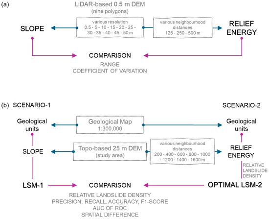 The main focus of this study is illustrated in Figure 2 and includes (a) testing the influence of DEM resolution on slope and relief energy, and (b) evaluating the performance of slope (scenario-1) versus relief energy (scenario-2) to support better LSM predictive results.