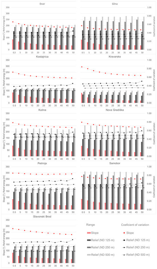 The range for slope decreases mainly due to the loss of the uppermost values, with a marked drop observed up to resolution of 20 m to 25 m. Beyond this point, the values stabilize, showing only a gradual decrease at coarser resolutions. In contrast, the range for relief energy remains mostly stable, with minor variations at higher resolutions and more pronounced changes only at 40 m and 50 m. These differences diminish as the ND value increases. For slope, CV values range from a minimum of 0.47 for the coarsest resolution (50 m) to a maximum of 0.85 for the highest resolution (0.5 m). The average value of 0.68 suggests high relative variability (CV > 0.5), with data points widely spread from the mean, indicating a significant level of variation. For relief energy, it is evident that the CV decreases as the ND increases. For relief energy with a ND of 125 m, the average CV value of 0.5 suggests high relative variability (CV > 0.5). For relief energy with an ND of 250 m, CV values are getting smaller, with the average CV value of 0.42, indicating a moderate level of data spread around the mean (0.2 < CV < 0.5). For relief energy with an ND of 500 m, CV values are getting even more smaller, with an average value of 0.37, indicating lower relative variability and suggesting more stability and consistency in the data. Due to the consistent pattern of decreasing CV values, the results suggest that, at very small ND values, the CV for relief energy would likely approach that slope. Similar findings were reported by [16], who noted that the ND must be large enough to include both valleys and interfluves in order to capture meaningful relief variation, rather than merely reflecting local slope. Overall, the analysis demonstrates that relief energy remains more stable than slope when DEM resolution decreases. Thus, it is reasonable to assume that relief energy will better represent the condition of geological units than slope when preparing small-scale LSMs.