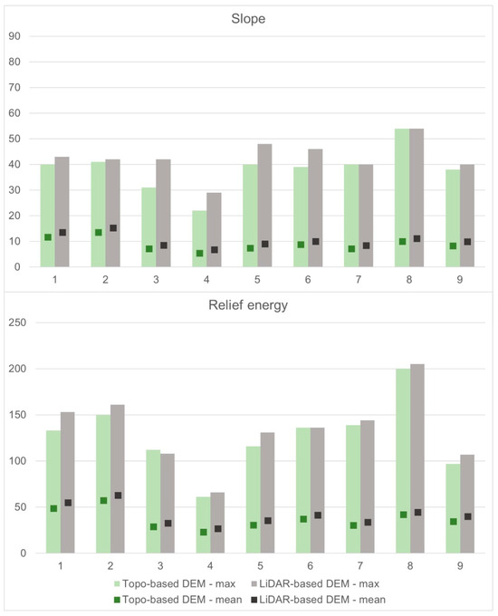 Comparison of the maximum and mean values of slope and relief energy between resampled 25 m LiDAR-based DEM and 25 m topo-based DEM for nine LiDAR polygons.