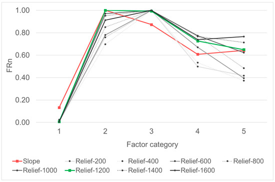 In view of relief energy, categories two and three, within a range from 147 m to 215 m, show the strongest relationship to landslide occurrence. Within these two categories, 85% of the landslides from the training dataset are present. Similarly to the slope, from that point to the highest relief energy values, the weights slightly decrease. However, there is a strong decrease toward the lowest category range, where only seven landslides are present (<1% of landslides from the training dataset). Following the same methodology for calculating the FRn weight values, different relief energy models were tested by changing the NDs (Figure 6). The results show that the minimum weight value of 1 is assigned to category one, across all LSM-2 models. The maximum weight values of 100 are assigned to category three in all LSM models, except for the LSM-2 model with an ND of 1200 m, where the highest weight value is within category two. The largest difference in FRn values among LSM-2 models, a difference of 39, is observed in relief category five. These factor weights directly influence the calculation of LSMs and their subsequent validation identified the optimal LSM-2.