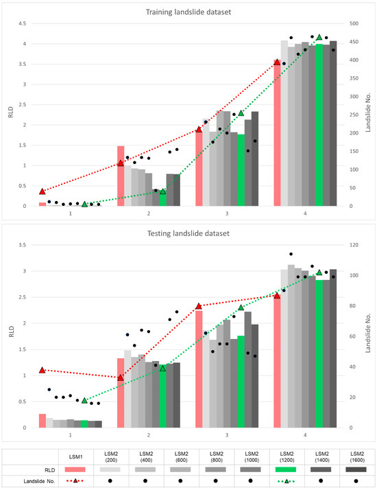 Relative landslide density (RLD) and the number of landslides (Landslide No.) within each landslide susceptibility zone (1—low, 2—moderate, 3—high, 4—very high) of LSM-1 and various LSMs-2 for training landslide dataset and testing landslide dataset.