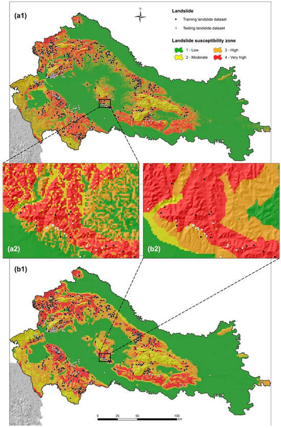 The visual interpretation of the spatial distribution of susceptibility zones shows a similar pattern in both LSMs, with high and very high susceptibility areas concentrated in common regions (Figure 8). However, in enlarged views shown in Figure 8 it is evident that the susceptibility zones in LSM-1 are represented by narrower areas and are significantly pixelated. They often transition abruptly from zone three to zone one or from zone four to zone two, and rarely directly from the highest susceptibility zone (4) to the lowest (1). On the other hand, susceptibility zones in the optimal LSM-2 are represented by slightly broader areas that attempt to more effectively generalize the data. Transitions between zones are much smoother and more continuous. These differences are a direct consequence of the methods used to calculate slope and relief energy, including a much larger ND (1200 m) used to derive relief energy for LSM-2.