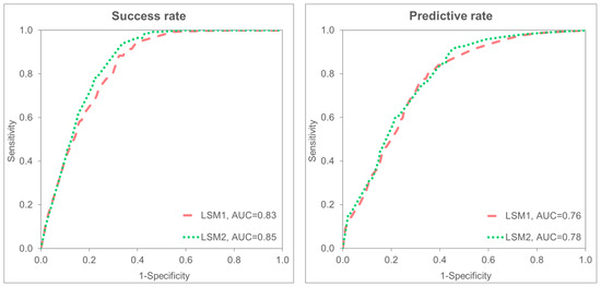 Although the visual comparison of LSMs shows significant differences, the ROC curves and AUC values are similar (Figure 9). According to the AUC success rate values of 0.83 and 0.85, the accuracy for both LSMs is excellent (0.8–0.9), and according to the AUC predictive rate values, it is acceptable (0.7–0.8).