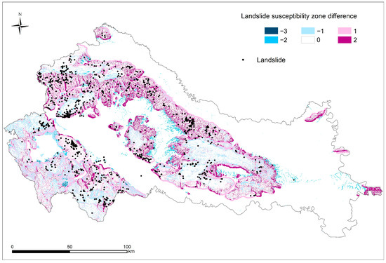 Finally, the comparison between LSMs is presented through the analysis of the spatial distribution of differences in landslide susceptibility zones (Figure 10, Table 5), which are calculated by subtracting two rasters, the optimal LSM-2 and LSM-1. Thus, positive values indicate that the LSM-2 zones are higher than the LSM-1 zones, while negative values refer to the differences where the LSM-1 zones are higher than the LSM-2 zones.