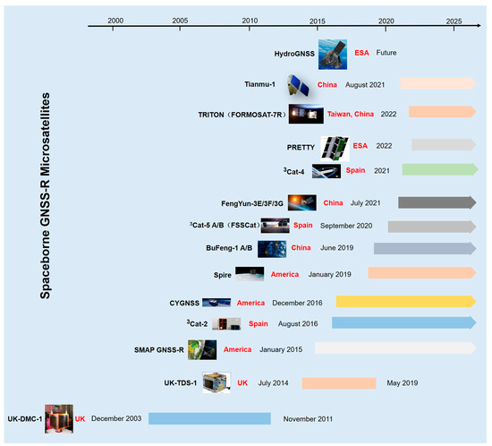 Development history of spaceborne GNSS-R satellite missions https://web.archive.org/web/20070609192647, http://merrbys.co.uk/about/introduction, https://podaac.jpl.nasa.gov/CYGNSS, https://nanosatlab.upc.edu/en/missions-and-projects/3cat-2, https://smap.jpl.nasa.gov/mission/description/, https://earth.esa.int/eogateway/documents/20142/37627/Spire-Product-Guide.pdf, https://satellite.nsmc.org.cn/FY3E/html/index.html, https://nanosatlab.upc.edu/en/missions-and-projects/fsscat; https://space.skyrocket.de/doc_sdat/fsscat.htm, https://nanosatlab.upc.edu/en/missions-and-projects/3cat-4, https://www.esa.int/ESA_Multimedia/Images/2021/09/PRETTY_CubeSat, https://www.esa.int/ESA_Multimedia/Images/2021/03/HydroGNSS, http://www.uux.cn/viewnews94839.html, https://sat.huijiwiki.com/wiki/%E5%A4%A9%E7%9B %AE%E5%8D%AB%E6%98%9F, https://space.skyrocket.de/doc_sdat/musat-1_muon.htm (the rectangle in the figure represents the completed satellite mission, and the arrow represents the satellite mission still in orbit).