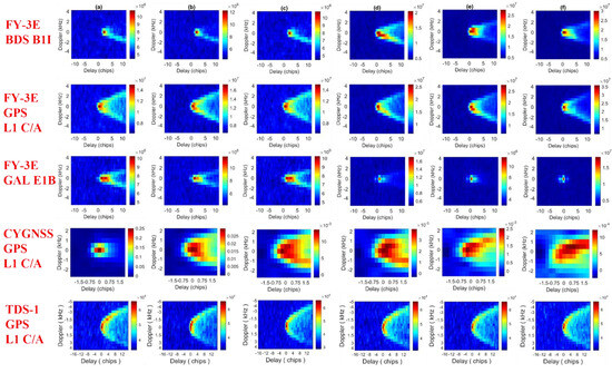 Examples of coherent and noncoherent DDMs observed by different GNSS-R satellites. Each row in the figure represents the DDMs of different GNSS-R satellites; (a–f) represent DDM under coherent or incoherent dominance.