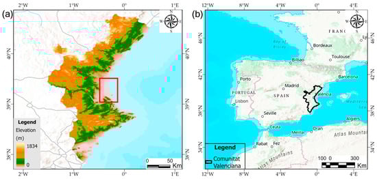 Study area. (a) Elevation map of the eastern Iberian Peninsula highlighting the study area (red box) within the southern part of the Metropolitan Area of Valencia. (b) Location of the Comunitat Valenciana within the Iberian Peninsula, outlined in black.