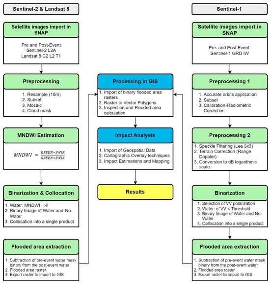 In the ESA STEP SNAP v.11, the pre- and post-event multispectral images were imported and then initially resampled into 10 m resolution with the nearest neighbors method for Sentinel-2 and the bicubic method for Landsat 8. The images corresponding to the same date were mosaicked into one, and then a subset was performed to the extent of the Area of Interest (AOI). Only the necessary spectral bands and masks were retained during this procedure to reduce the processing volume. Then, a cloud mask for each date was created using the respective cloud masks included in the product according to their type and confidence-probability (e.g., cloud shadows, cirrus, clouds, etc.) for each date via application band math. This was then subtracted from the respective image. The next step was to calculate the MNDWI for the pre- and post-event images with band math. Afterward, with the produced MNDWI, the threshold of MNDWI => 0 was applied to create a binary image of 1 corresponding to water and 0 to non-water areas. After the binarization, pre- and post-event products were collocated into one. Then, the pre-event water mask was subtracted from the post-event one to remove the permanent water from the AOI and retain only the floodwater. The final product is a binary raster clear of most clouds and permanent water, and the value 1 represents the flood extent [58].