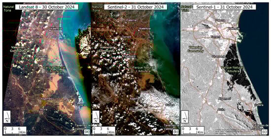 Satellite images used in flood extent delineation. (a) Landsat 8—30 October 2024 optical image in natural colors; (b) Sentinel-2—31 October 2024 optical image in natural colors; (c) Sentinel-1—31 October 2024 SAR image in σ°VV backscatter grayscale.